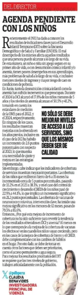 El INEI ha publicado recientes resultados sobre indicadores clave del Desarrollo Infantil Temprano (DIT) en la Encuesta Demográfica y de Salud y Familiar (Endes), revelando retrocesos preocupantes en Junín: en 2024, la desnutrición crónica infantil llegó al 17.8% y la anemia infantil superó el 40%, cifras superiores a años anteriores. Aunque se registran avances en la cobertura de servicios como el control de crecimiento y desarrollo, suplementación con hierro y vacunación, estos aún no se traducen en mejoras sustantivas, debido a factores como la baja adherencia en el hogar y limitaciones en el acceso a servicios básicos como el agua segura. Ante ello, se requiere una acción articulada entre los tres niveles de gobierno y la población, priorizando no solo el acceso sino también la calidad de los servicios y el compromiso familiar para lograr un impacto real en la infancia.
