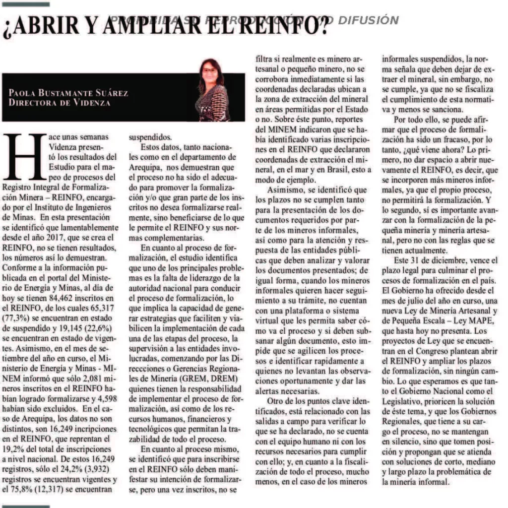 Videnza presentó un estudio sobre el Registro Integral de Formalización Minera (Reinfo) que revela su fracaso desde su creación en 2017. A la fecha, hay 84,462 inscritos, de los cuales el 77,3% están suspendidos y solo el 22,6% vigentes; apenas 2,081 han logrado formalizarse (menos del 3%) y 4,598 fueron excluidos. En Arequipa, con el 19,2% del total nacional, el 75,8% de los inscritos también se encuentran suspendidos. El estudio señala la falta de liderazgo institucional, deficiencias en el control de requisitos, incumplimiento de plazos y escasa fiscalización, lo que ha permitido que muchos se beneficien del Reinfo sin intención real de formalizarse. Ante el vencimiento del plazo legal este 31 de diciembre y sin una nueva Ley MAPE a la vista, reabrir el Reinfo solo perpetuaría los mismos errores. Se exige una respuesta urgente del Ejecutivo, el Congreso y los gobiernos regionales para atender de forma integral la problemática de la minería informal.