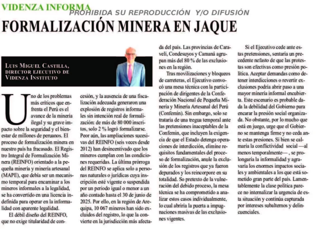 Uno de los principales problemas del Perú es el avance de la minería ilegal, alimentado por el fracaso del proceso de formalización minera y el mal diseño del Registro Integral de Formalización Minera (REINFO), que se ha convertido en una licencia indefinida para operar en la informalidad. Pese a que más de 80,000 mineros se inscribieron, solo el 2% se formalizó, y sucesivas prórrogas han desincentivado el cumplimiento de requisitos. La reciente exclusión de 10,067 mineros en Arequipa —mayormente en Caravelí, Condesuyos y Camaná— desató protestas que llevaron al Gobierno a instalar una mesa técnica con dirigentes de la Confemin. Sin embargo, las demandas de este gremio —como detener interdicciones y reincorporar a los excluidos— podrían agravar la informalidad si el Ejecutivo cede ante la presión. Urge que el Estado se mantenga firme, pues ceder sentaría un precedente peligroso y perpetuaría los impactos sociales, ambientales y de criminalidad asociados a la minería ilegal.