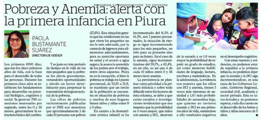 Los primeros cinco años de vida son fundamentales para el desarrollo integral de niñas y niños, pero la pobreza limita gravemente sus oportunidades, al afectar su nutrición, salud y cuidado. En Piura, un tercio de la población vive en pobreza, y la desnutrición crónica infantil y la anemia siguen en aumento: afectan ya al 14.3% y 42.4% de los menores, respectivamente. Estas condiciones tienen consecuencias a largo plazo en el aprendizaje, la salud mental y el desarrollo cognitivo. Frente a esta realidad, es urgente que todos los sectores actúen de forma articulada, porque cada día cuenta en la vida de la primera infancia.