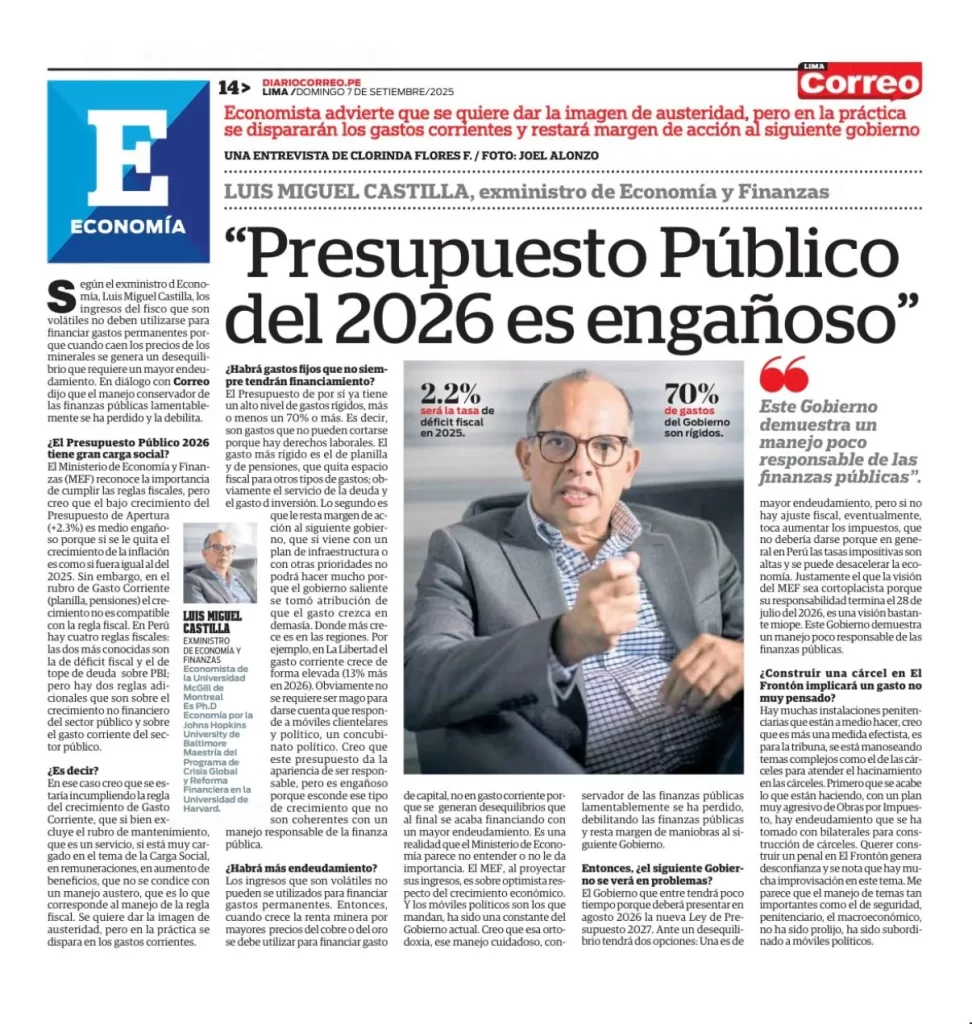 Uno tiene que ver con el crecimiento del gasto corriente, especialmente el asociado a la planilla estatal y al pago de pensiones, que no se condice con la austeridad anunciada. Recordemos que las reglas fiscales no solo imponen topes al déficit fiscal y al endeudamiento como proporción del PBI, sino que establecen también crecimientos máximos al gasto no financiero del sector público y al gasto corriente. Lo establecido en el proyecto de ley presentado por el Ejecutivo no asegura el cumplimiento de esta restricción legal. Probablemente, sabiendo que la rendición de cuentas corresponderá a las autoridades entrantes, en el MEF parece prevalecer una mirada cortoplacista con miras a llegar al 28 de julio de 2026 como sea y se estaría desentendiendo del manejo fiscal de mediano plazo, potencialmente mellando su credibilidad.