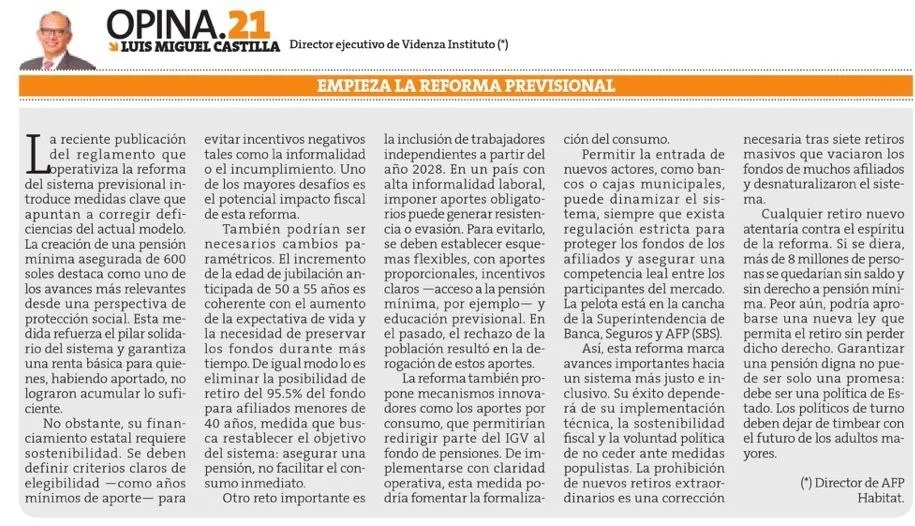 El reglamento de la reforma previsional recientemente publicado no solo da operatividad a la Ley de modernización aprobada el año pasado por el Congreso de la República, sino que incorpora mecanismos esenciales para asegurar la universalidad, equidad y sostenibilidad del sistema previsional. Entre sus principales virtudes destacan mayor cobertura desde juventud, pensiones mínimas protegidas por el Estado, movilidad entre sistemas y apertura a nuevos administradores, nuevas modalidades de aportes (voluntarios, por consumo) y participación formal de independientes, y protección frente a retiros injustificados, entre otros.